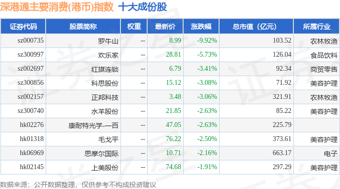 深港通主要消费(港币)(983022)指数十大成份股详情如下: