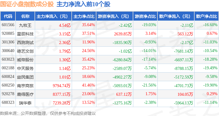 资金流向方面,国证小盘(980202)指数成份股当日主力资金净流出合计13.48亿元,游资资金净流出合计19.86亿元,散户资金净流入合计32.12亿元。成份股资金流向详情见下表: