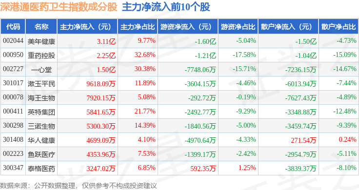 资金流向方面,深港通医药卫生(983023)指数成份股当日主力资金净流入合计5.37亿元,游资资金净流出合计6.42亿元,散户资金净流入合计1.06亿元。成份股资金流向详情见下表: