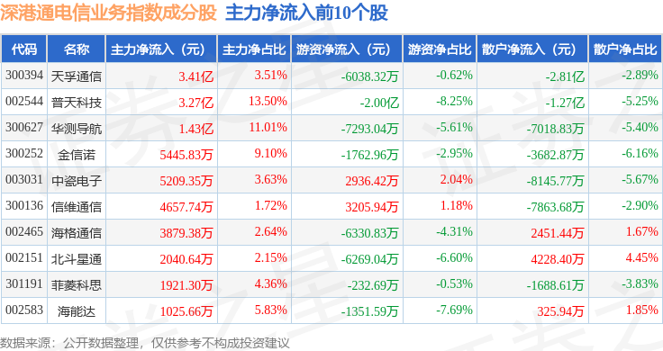 资金流向方面,深港通电信业务(983029)指数成份股当日主力资金净流出合计21.83亿元,游资资金净流入合计4.83亿元,散户资金净流入合计17.0亿元。成份股资金流向详情见下表: