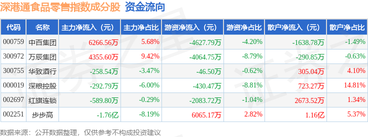 资金流向方面,深港通食品零售(983037)指数成份股当日主力资金净流出合计8156.74万元,游资资金净流出合计5188.06万元,散户资金净流入合计1.33亿元。成份股资金流向详情见下表: