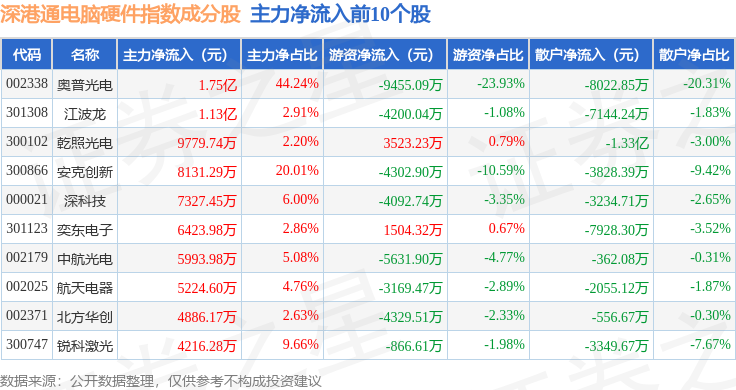 资金流向方面,深港通电脑硬件(983043)指数成份股当日主力资金净流出合计65.26亿元,游资资金净流入合计15.35亿元,散户资金净流入合计49.92亿元。成份股资金流向详情见下表: