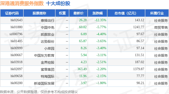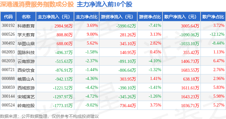 资金流向方面,深港通消费服务(983045)指数成份股当日主力资金净流出合计1.97亿元,游资资金净流出合计1.09亿元,散户资金净流入合计3.06亿元。成份股资金流向详情见下表: