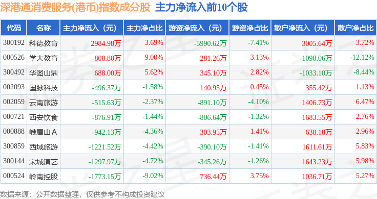 资金流向方面,深港通消费服务(港币)(983046)指数成份股当日主力资金净流出合计1.97亿元,游资资金净流出合计1.09亿元,散户资金净流入合计3.06亿元。成份股资金流向详情见下表:
