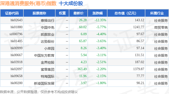 深港通消费服务(港币)(983046)指数十大成份股详情如下: