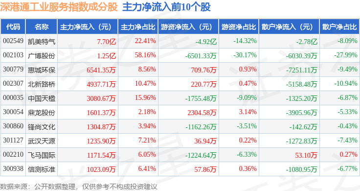 资金流向方面,深港通工业服务(983055)指数成份股当日主力资金净流入合计4.86亿元,游资资金净流出合计5.37亿元,散户资金净流入合计5060.7万元。成份股资金流向详情见下表: