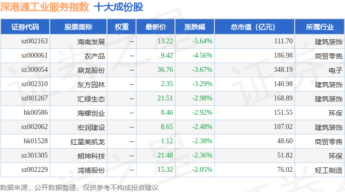 证券之星消息,12月18日,深港通工业服务(983055)指数报收于2168.41点,跌0.27%,成交173.35亿元,换手率1.37%。当日该指数成份股中,上涨的有46家,广博股份以10.04%的涨幅领涨,下跌的有39家,海南发展以5.64%的跌幅领跌。