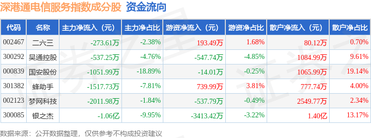 资金流向方面,深港通电信服务(983057)指数成份股当日主力资金净流出合计1.59亿元,游资资金净流出合计3579.46万元,散户资金净流入合计1.95亿元。成份股资金流向详情见下表: