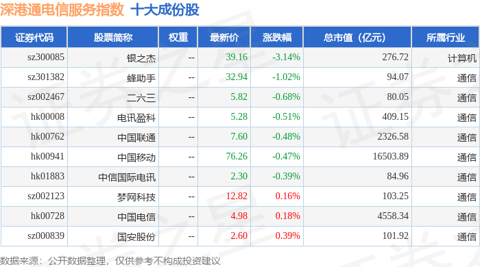 深港通电信服务(983057)指数十大成份股详情如下: