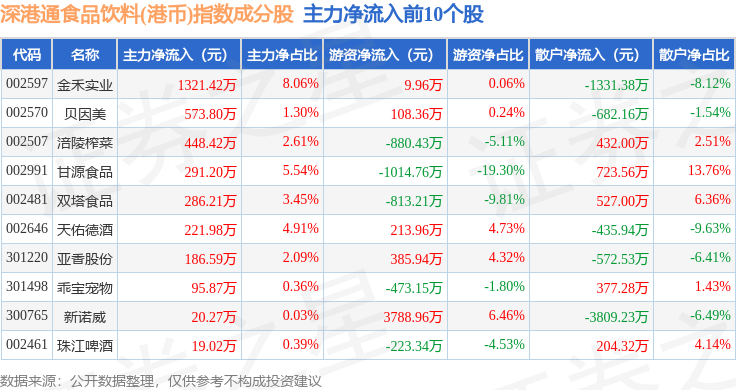 资金流向方面,深港通食品饮料(港币)(983066)指数成份股当日主力资金净流出合计5.93亿元,游资资金净流出合计2622.8万元,散户资金净流入合计6.19亿元。成份股资金流向详情见下表: