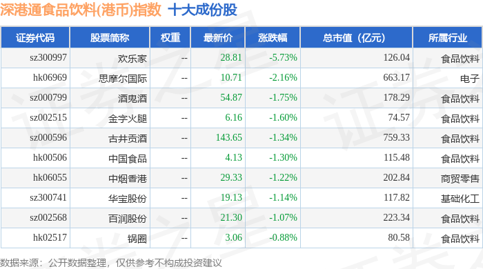 深港通食品饮料(港币)(983066)指数十大成份股详情如下:
