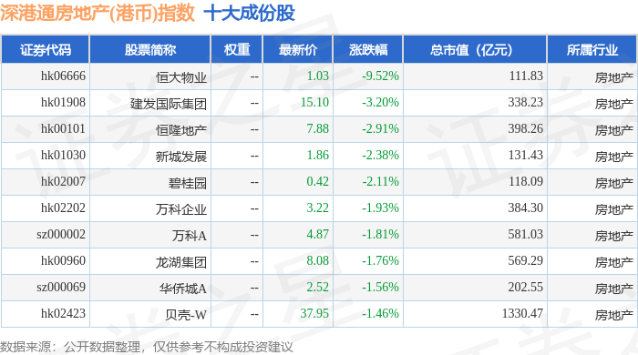 深港通房地产(港币)(983072)指数十大成份股详情如下: