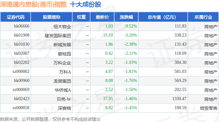 深港通内房股(港币)(983084)指数十大成份股详情如下:
