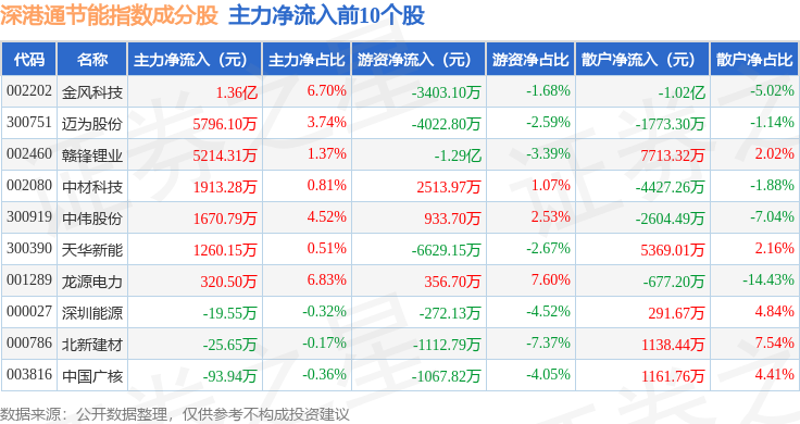 资金流向方面,深港通节能(983085)指数成份股当日主力资金净流出合计39.77亿元,游资资金净流入合计7.57亿元,散户资金净流入合计32.2亿元。成份股资金流向详情见下表: