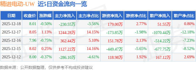 证券之星消息,截至2025年12月18日收盘,精进电动(688280)报收于8.01元,下跌0.5%,换手率1.54%,成交量8.01万手,成交额6468.93万元。