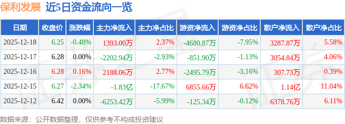 证券之星消息,截至2025年12月18日收盘,保利发展(600048)报收于6.25元,下跌0.48%,换手率0.79%,成交量94.12万手,成交额5.89亿元。