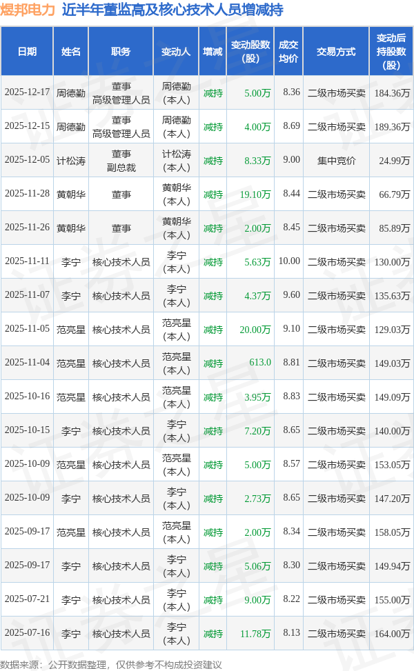 煜邦电力近半年内的董监高及核心技术人员增减持详情如下: