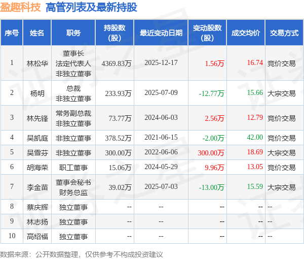 证券之星消息,根据12月18日市场公开信息、上市公司公告及交易所披露数据整理,盈趣科技(002925)最新董监高及相关人员股份变动情况:2025年12月17日公司董事林松华共增持公司股份1.56万股,占公司总股本为0.002%。变动期间公司股价上涨0.94%,12月17日当日收盘报17.15元。