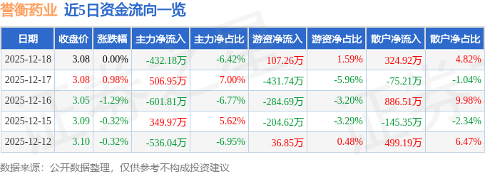 证券之星消息,截至2025年12月18日收盘,誉衡药业(002437)报收于3.08元,上涨0.0%,换手率1.04%,成交量21.77万手,成交额6735.06万元。