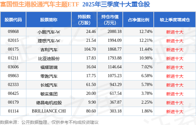 富国恒生港股通汽车主题ETF基金成立于2025年5月19日,基金经理为田希蒙,基金跟踪标的为恒生港股通汽车主题指数,成立以来超额回报为2.87%,近一个月超额回报为-0.18%。最新披露的基金持仓数据显示,截止2025年9月30日,该基金第一大重仓股为小鹏汽车-W(09868),持股占比为12.74%。