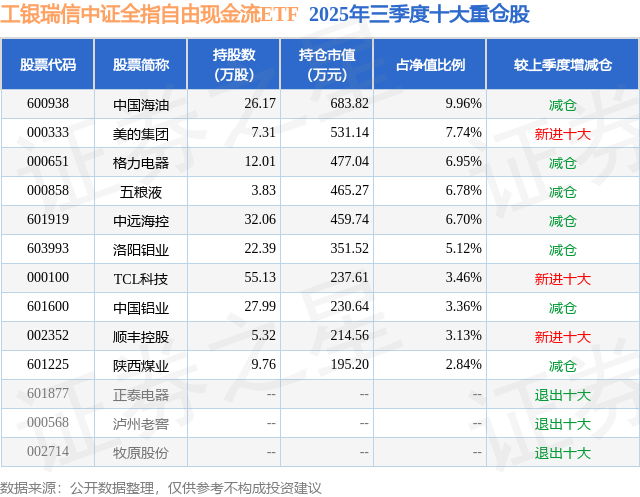 工银瑞信中证全指自由现金流ETF基金成立于2025年4月30日,基金经理为何顺 袁康洪,基金跟踪标的为中证全指自由现金流指数,成立以来超额回报为1.77%,近一个月超额回报为0.07%。最新披露的基金持仓数据显示,截止2025年9月30日,该基金第一大重仓股为中国海油(600938),持股占比为9.96%。