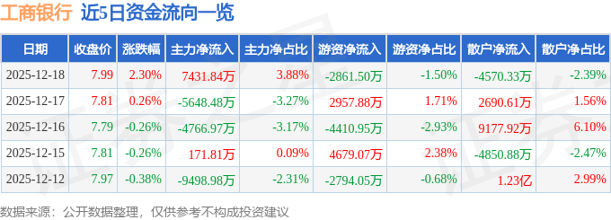 证券之星消息,截至2025年12月18日收盘,工商银行(601398)报收于7.99元,上涨2.3%,换手率0.09%,成交量241.75万手,成交额19.13亿元。