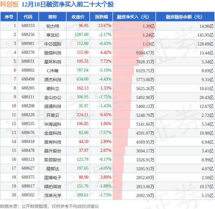 科创板融资净买入前三分别为:铂力特(688333)融资净买入1.3亿元、寒武纪(688256)融资净买入1.24亿元、中芯国际(688981)融资净买入1.13亿元,前20具体见下表: