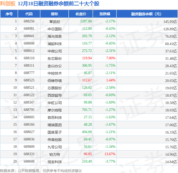 科创板融资融券余额前三分别为:寒武纪(688256)融资融券余额145.95亿元、中芯国际(688981)融资融券余额128.89亿元、海光信息(688041)融资融券余额76.83亿元,前20具体见下表:
