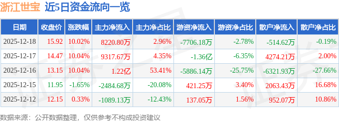 12月18日的资金流向数据方面,主力资金净流入8220.8万元,占总成交额2.96%,游资资金净流出7706.18万元,占总成交额2.78%,散户资金净流出514.62万元,占总成交额0.19%。