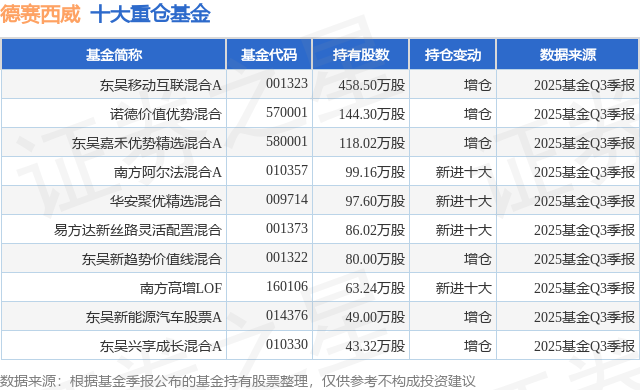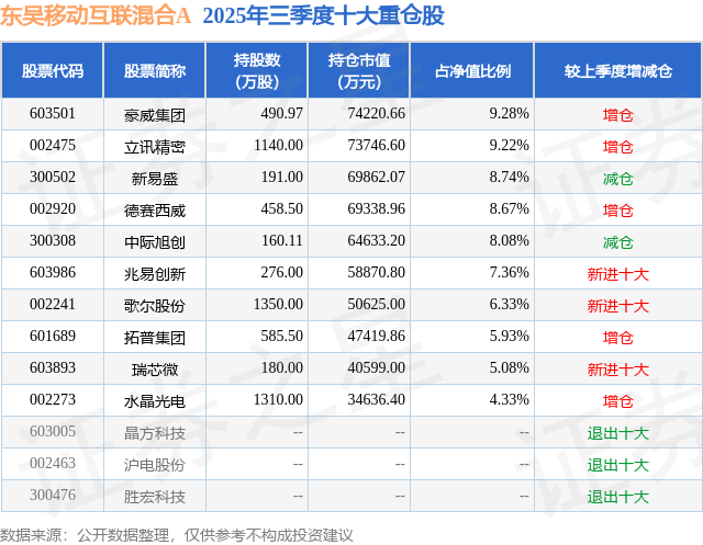 根据2025基金Q3季报公募基金重仓股数据,重仓该股的公募基金共91家,其中持有数量最多的公募基金为东吴基金的东吴移动互联混合A。东吴移动互联混合A目前规模为29.54亿元,最新净值5.7385(12月18日),较上一交易日下跌2.11%,近一年上涨79.73%。该公募基金现任基金经理为刘元海。刘元海在任的基金产品包括:东吴新趋势价值线混合,管理时间为2019年4月29日至今,期间收益率为578.28%;东吴新能源汽车股票A,管理时间为2022年1月25日至今,期间收益率为78.67%;东吴嘉禾优势精选混合A,管理时间为2023年8月15日至今,期间收益率为132.28%。