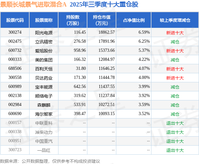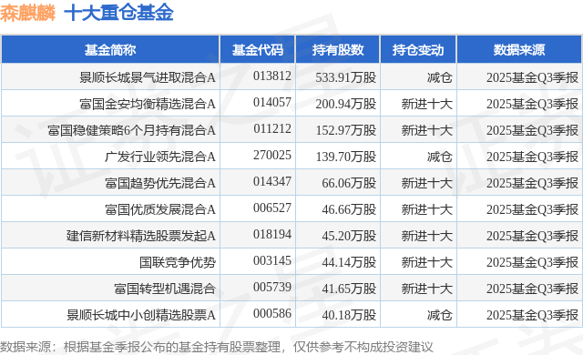 根据2025基金Q3季报公募基金重仓股数据,重仓该股的公募基金共20家,其中持有数量最多的公募基金为景顺长城基金的景顺长城景气进取混合A。景顺长城景气进取混合A目前规模为23.91亿元,最新净值0.7754(12月18日),较上一交易日下跌1.36%,近一年上涨13.6%。该公募基金现任基金经理为张靖。张靖在任的基金产品包括:景顺长城策略精选灵活配置混合A,管理时间为2014年10月25日至今,期间收益率为338.08%;景顺长城中小创精选股票A,管理时间为2022年11月19日至今,期间收益率为29.57%;景顺长城中小盘混合A,管理时间为2022年11月19日至今,期间收益率为24.25%;景顺长城成长趋势股票A,管理时间为2023年7月25日至今,期间收益率为11.54%。