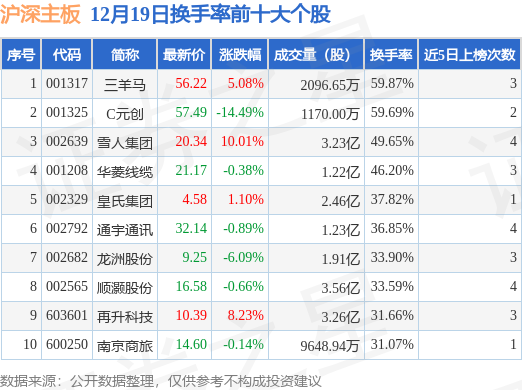 当日沪深主板换手率前10大个股中4只个股收涨,平均涨幅6.11%,其中三羊马(001317)以换手率59.87%排第一,8只个股近5个交易日中多次上榜。