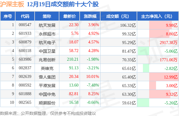 当日沪深主板成交额前10大个股中6只个股收涨,平均涨幅6.0%,其中航天发展(000547)以成交额106.32亿元排第一。从主力资金流入看,成交额前10大个股中有7只个股呈现主力资金净流入。