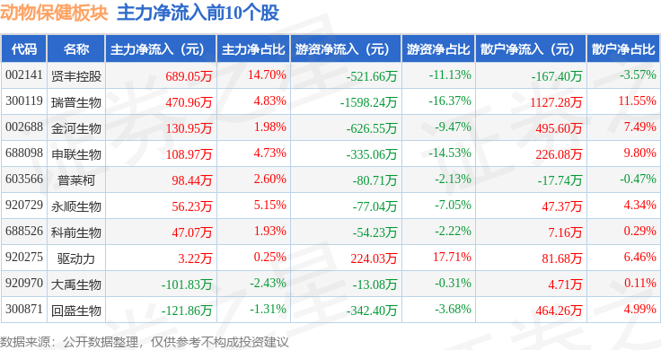 从资金流向上来看,当日动物保健板块主力资金净流出1.29亿元,游资资金净流出2755.92万元,散户资金净流入1.57亿元。动物保健板块个股资金流向见下表: