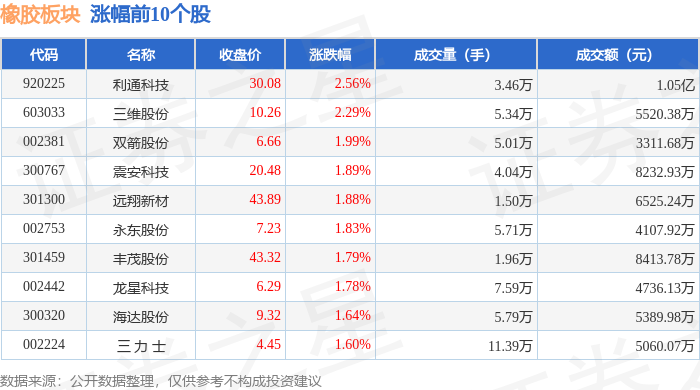 证券之星消息,12月19日橡胶板块较上一交易日下跌0.0%,C元创领跌。当日上证指数报收于3890.45,上涨0.36%。深证成指报收于13140.22,上涨0.66%。橡胶板块个股涨跌见下表: