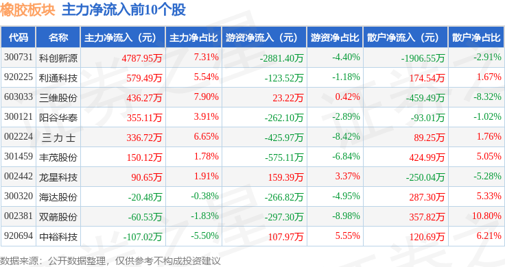 从资金流向上来看,当日橡胶板块主力资金净流出7130.87万元,游资资金净流出1506.06万元,散户资金净流入8636.93万元。橡胶板块个股资金流向见下表: