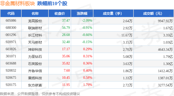 从资金流向上来看,当日非金属材料板块主力资金净流出5354.1万元,游资资金净流入983.52万元,散户资金净流入4370.57万元。非金属材料板块个股资金流向见下表: