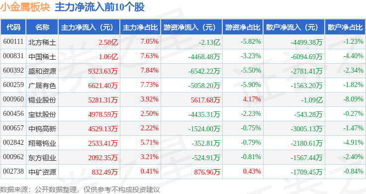 从资金流向上来看,当日小金属板块主力资金净流入2.32亿元,游资资金净流出3.7亿元,散户资金净流入1.38亿元。小金属板块个股资金流向见下表: