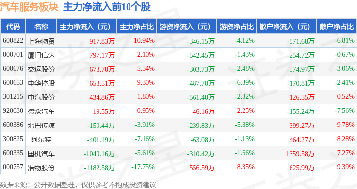 从资金流向上来看,当日汽车服务板块主力资金净流出653.73万元,游资资金净流出2818.08万元,散户资金净流入3471.82万元。汽车服务板块个股资金流向见下表: