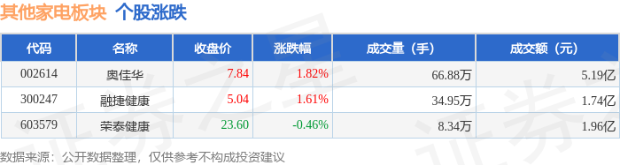 证券之星消息,12月19日其他家电板块较上一交易日上涨0.85%,奥佳华领涨。当日上证指数报收于3890.45,上涨0.36%。深证成指报收于13140.22,上涨0.66%。其他家电板块个股涨跌见下表: