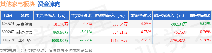 从资金流向上来看,当日其他家电板块主力资金净流出4698.15万元,游资资金净流入2838.87万元,散户资金净流入1859.28万元。其他家电板块个股资金流向见下表:
