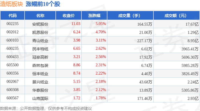证券之星消息,12月19日造纸板块较上一交易日上涨1.5%,安妮股份领涨。当日上证指数报收于3890.45,上涨0.36%。深证成指报收于13140.22,上涨0.66%。造纸板块个股涨跌见下表: