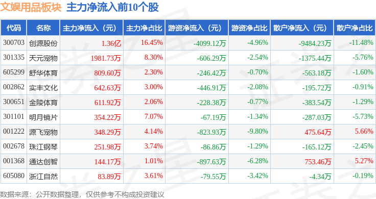 从资金流向上来看,当日文娱用品板块主力资金净流入8515.59万元,游资资金净流出9946.74万元,散户资金净流入1431.15万元。文娱用品板块个股资金流向见下表: