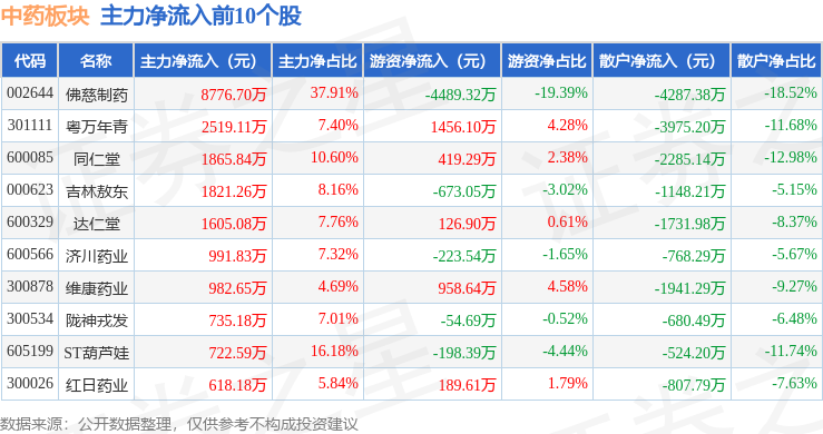 从资金流向上来看,当日中药板块主力资金净流出3857.06万元,游资资金净流出9028.32万元,散户资金净流入1.29亿元。中药板块个股资金流向见下表: