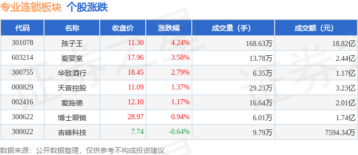 证券之星消息,12月19日专业连锁板块较上一交易日上涨2.11%,孩子王领涨。当日上证指数报收于3890.45,上涨0.36%。深证成指报收于13140.22,上涨0.66%。专业连锁板块个股涨跌见下表: