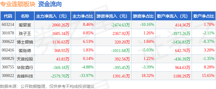 从资金流向上来看,当日专业连锁板块主力资金净流入2066.11万元,游资资金净流入590.33万元,散户资金净流出2656.44万元。专业连锁板块个股资金流向见下表: