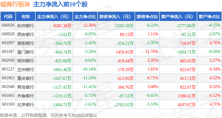 从资金流向上来看,当日城商行板块主力资金净流出2.9亿元,游资资金净流出2219.23万元,散户资金净流入3.12亿元。城商行板块个股资金流向见下表: