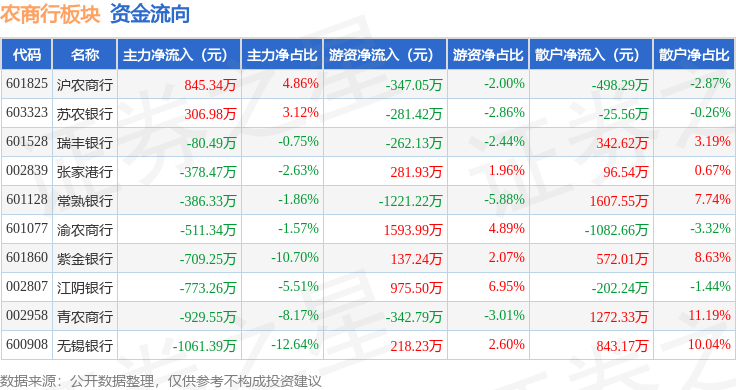 从资金流向上来看,当日农商行板块主力资金净流出3677.76万元,游资资金净流入752.29万元,散户资金净流入2925.47万元。农商行板块个股资金流向见下表: