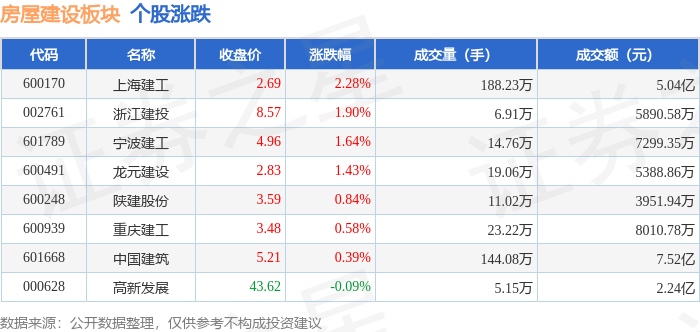 证券之星消息,12月19日房屋建设板块较上一交易日上涨0.64%,上海建工领涨。当日上证指数报收于3890.45,上涨0.36%。深证成指报收于13140.22,上涨0.66%。房屋建设板块个股涨跌见下表: