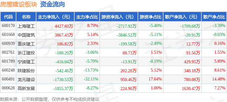 从资金流向上来看,当日房屋建设板块主力资金净流入3757.16万元,游资资金净流出5311.58万元,散户资金净流入1554.42万元。房屋建设板块个股资金流向见下表: